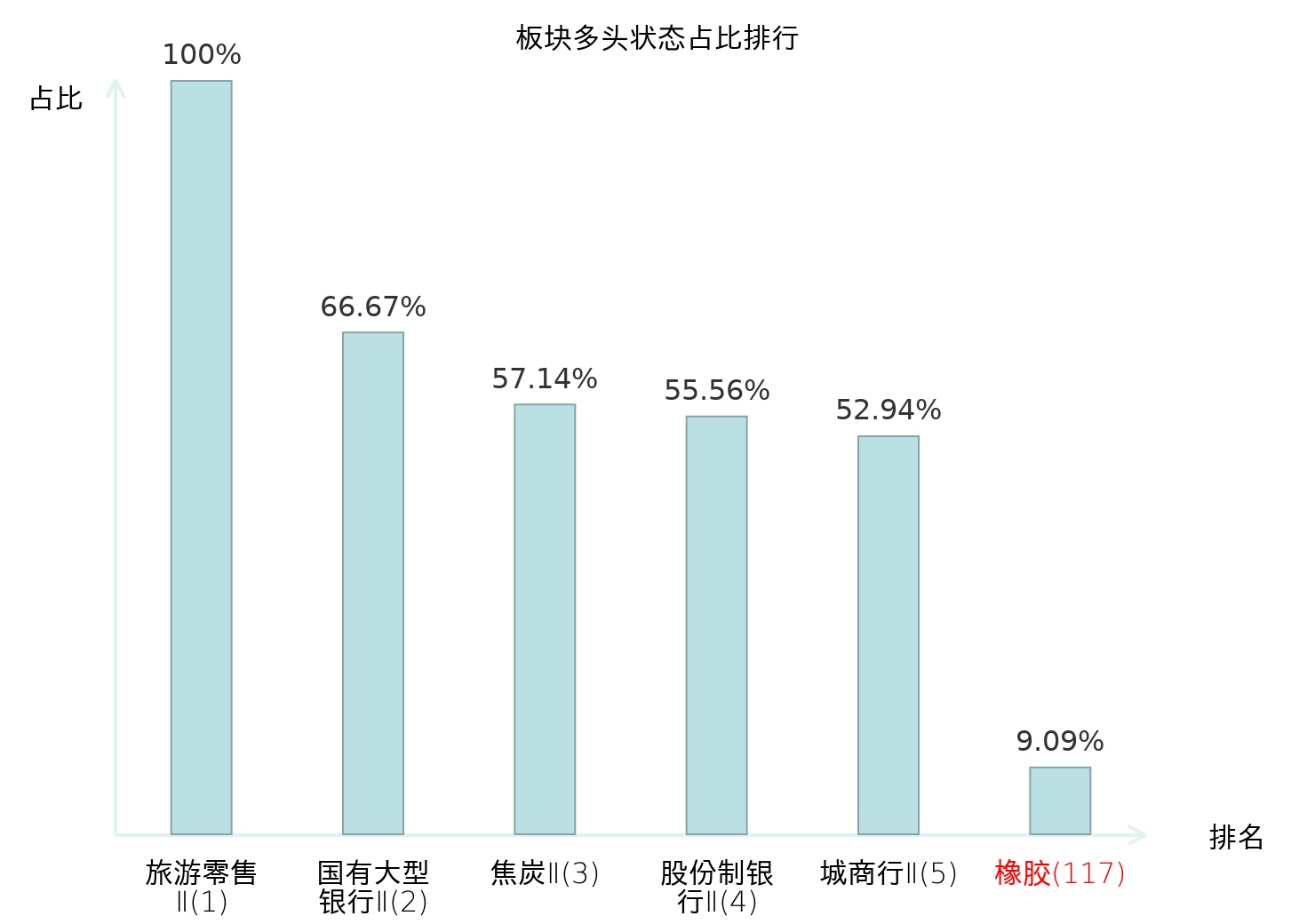 全市场所有行业板块中主力多头状态占比排名中,旅游零售Ⅱ板块位居第一。其他家电Ⅱ板块名次提升最快,较昨日上升101位。