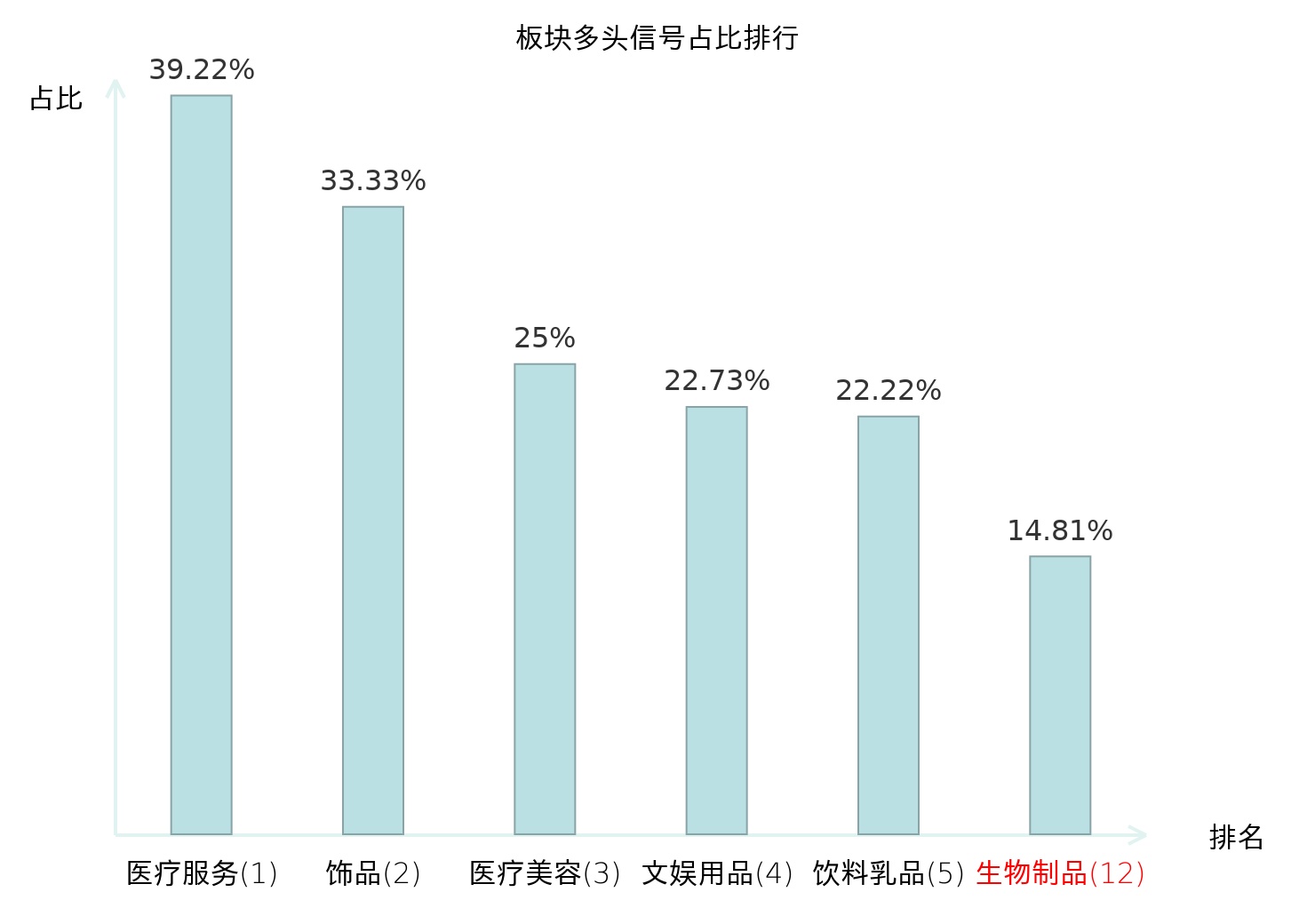 全市场所有行业板块中主力多头信号占比排名中,医疗服务板块位居第一。医疗美容板块名次提升最快,较昨日上升124位。
