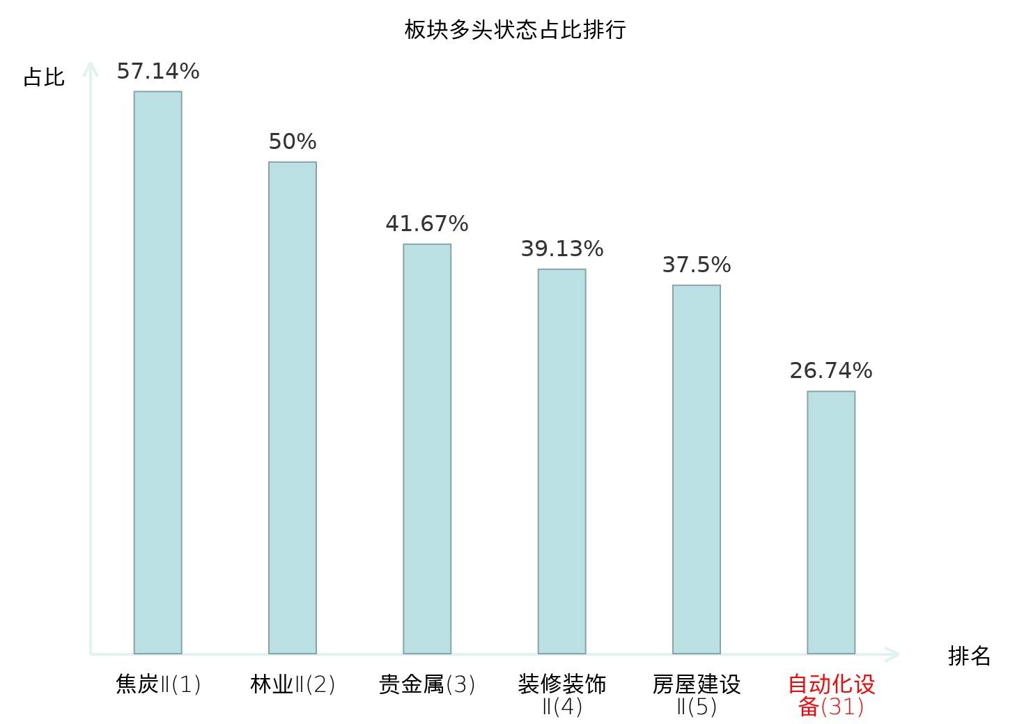 全市场所有行业板块中主力多头状态占比排名中,焦炭Ⅱ板块位居第一。白色家电板块名次提升最快,较昨日上升84位。