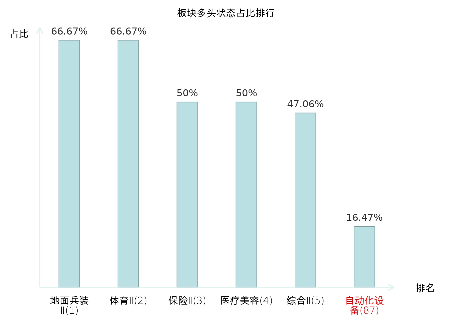 全市场所有行业板块中主力多头状态占比排名中,地面兵装Ⅱ板块位居第一。保险Ⅱ板块名次提升最快,较昨日上升82位。