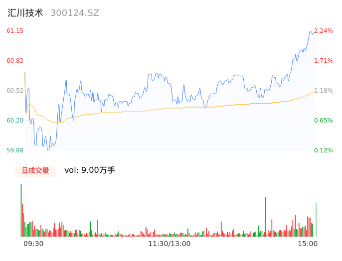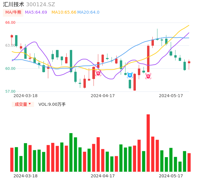 05月17日,汇川技术收报60.92,股价涨幅1.86%,成交金额5.44亿元,换手率0.38%。