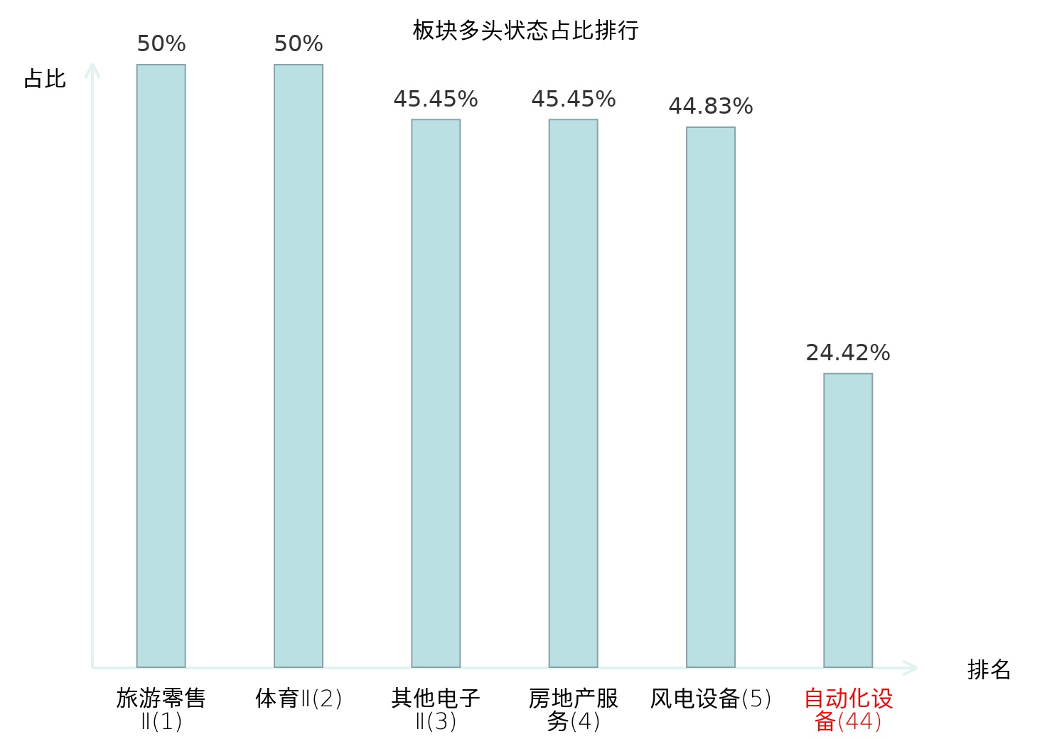 全市场所有行业板块中主力多头状态占比排名中,旅游零售Ⅱ板块位居第一。其他家电Ⅱ板块名次提升最快,较昨日上升112位。
