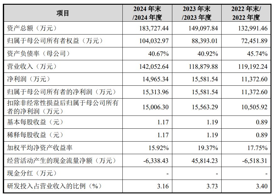 财务方面,于2022年度、2023年度、2024年度,公司实现营业收入分别约为11.92亿元、11.89亿元、14.21亿元,同期实现净利润分别约为1.14亿元、1.56亿元、1.50亿人民币。
