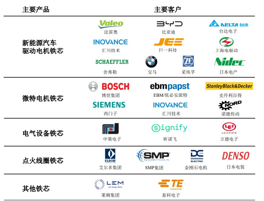 招股书披露,华新精科专注于精密冲压领域产品的研发、生产和销售。公司主要产品为各类精密冲压铁芯及铁芯生产相关的精密冲压模具。其中,精密冲压铁芯是公司的主要产品,可分为新能源汽车驱动电机铁芯、微特电机铁芯、电气设备铁芯、点火线圈铁芯等多种类型,主要供应给国内外众多大型汽车零部件厂商、电机制造厂商、电气设备制造厂商、汽车整车厂等各类企业。