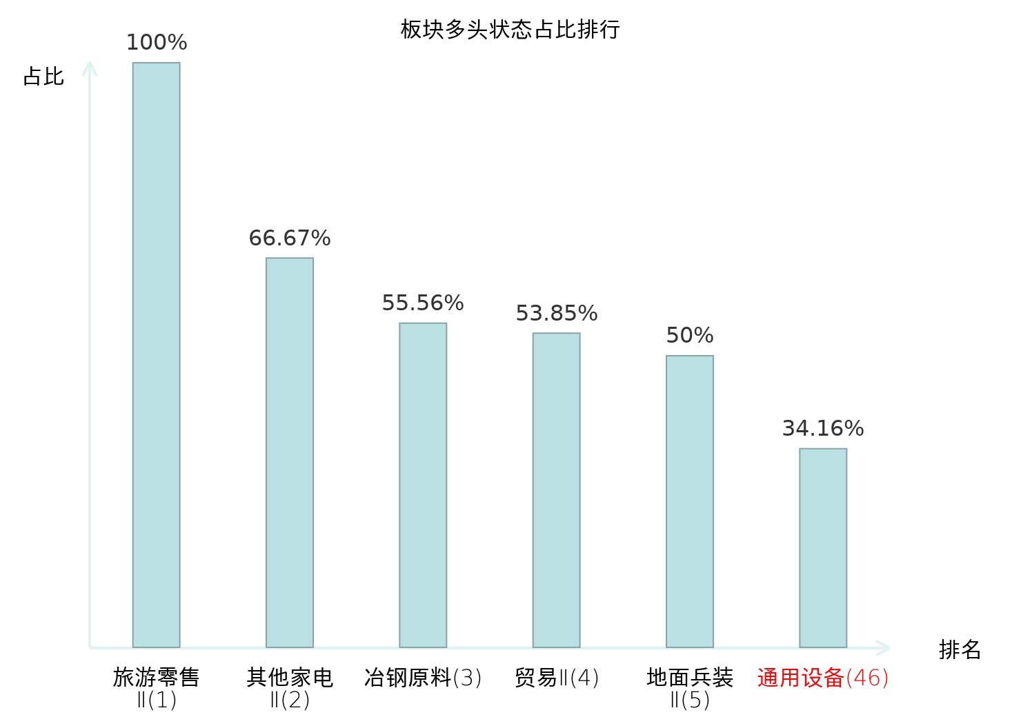 全市场所有行业板块中主力多头状态占比排名中,旅游零售Ⅱ板块位居第一。房屋建设Ⅱ板块名次提升最快,较昨日上升58位。