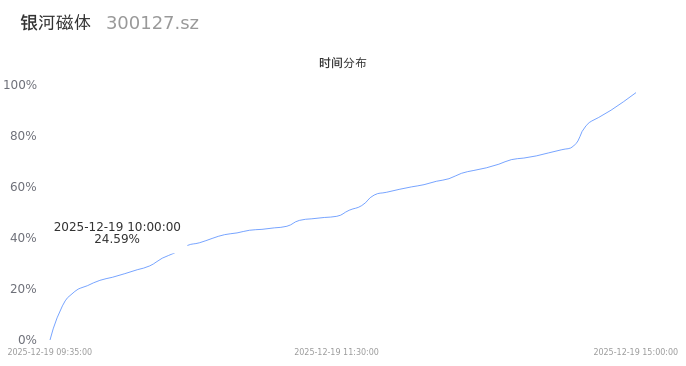 300127银河磁体2025年12月19日成交4.14万手,成交金额1.25亿,相较昨日放量4405手,换手率1.80%,成交清淡。