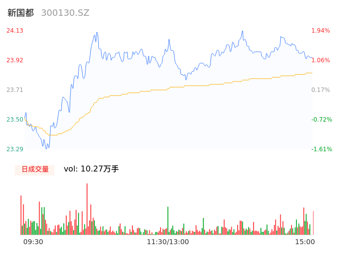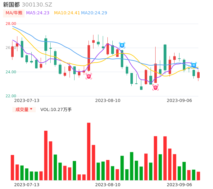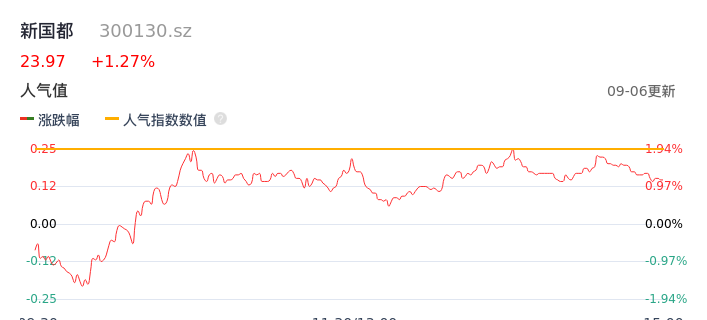 09月06日,新国都收报23.97,股价涨幅1.27%,成交金额2.45亿元,换手率2.53%。