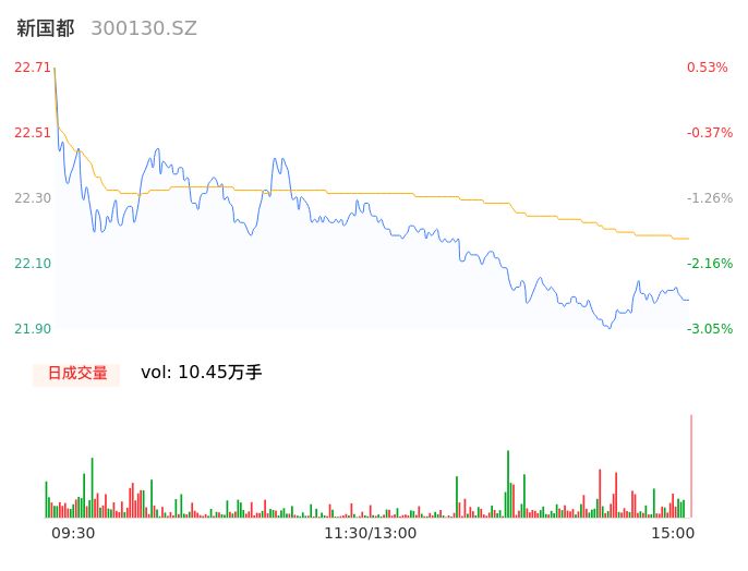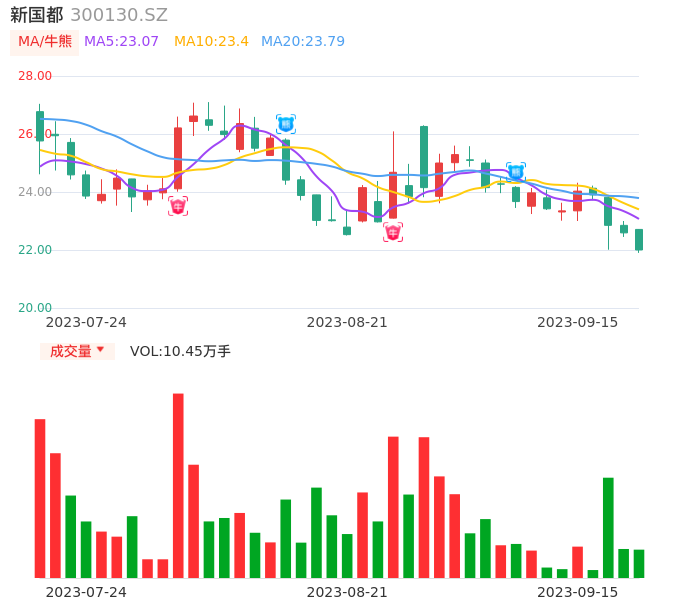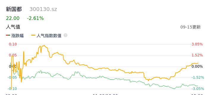 09月15日,新国都收报22.00,股价涨幅-2.61%,成交金额2.32亿元,换手率2.57%。