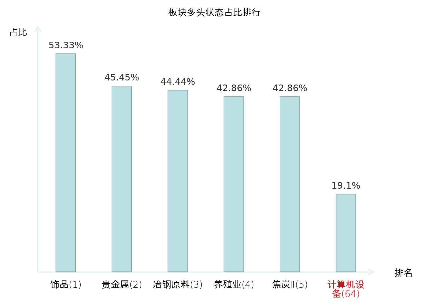 全市场所有行业板块中主力多头状态占比排名中,饰品板块位居第一。非金属材料Ⅱ板块名次提升最快,较昨日上升58位。