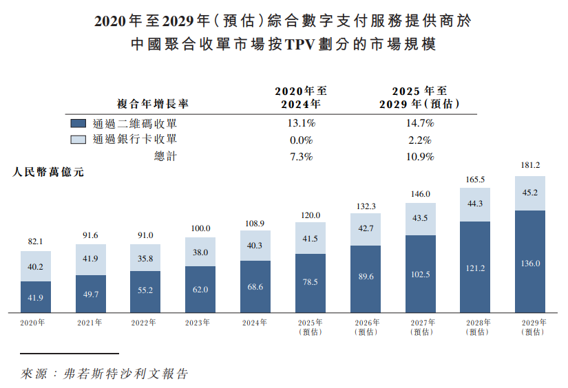 聚合收单市场方面,近年来,条形码及二维码支付方式广泛应用显着推动收单业务的增长。展望未来,不断扩大的商户基础将推动收单服务需求持续攀升。聚合收单市场规模从2020年的人民币82.1万亿元增长至2024年的人民币108.9万亿元,2020年至2024年复合年增长率为7.3%。未来,收单市场规模预计将于2029年增至人民币181.2万亿元,2025年至2029年复合年增长率将达10.9%。就细分市场而言,二维码收单市场规模增长更快,复合年增长率为14.7%。