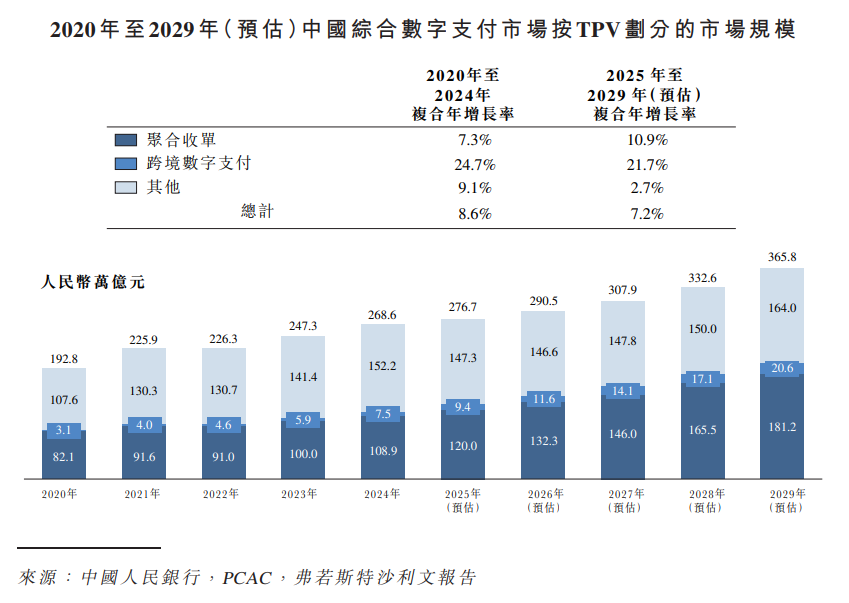跨境数字支付市场,近年来,中国跨境电商市场逐步扩张,这得益于海外市场的强劲需求及先进的数字基础设施及覆盖全球的物流网络发展。电商活动激增继而推动B2C跨境数字支付行业的增长。同时,中国公司扩大海外业务趋势日益明显,这将进一步推动B2B跨境数字支付格局的演变。展望未来,随着全球及中国国内贸易环境持续演变,并在市场持续整合及支付技术进步的支撑下,跨境数字支付市场有望实现增长,这或可提高交易的效率及便利性。按TPV划分的中国跨境数字支付市场规模从2020年的人民币3.1万亿元增长至2024年的人民币7.5万亿元,2020至2024年复合年增长率为24.7%,并预计将于2029年增至人民币20.6万亿元,2025至2029年复合年增长率将达21.7%。