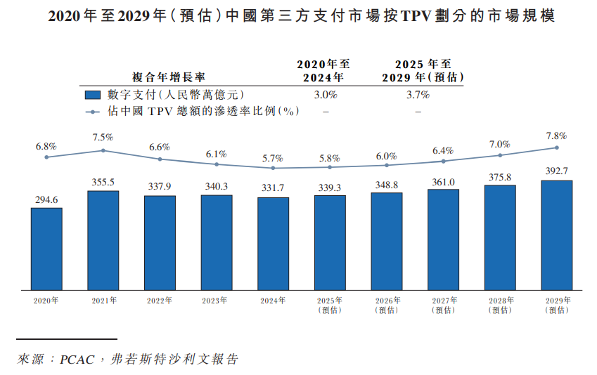 近年来,中国第三方支付行业在经济增长的推动下实现快速发展,人均GDP和消费总额的提升便是凭证。随着人工智能、区块链及大数据等支付技术的进步,该行业展现出巨大的增长潜力。根据弗若斯特沙利文,以TPV计,中国第三方支付市场近年来保持稳健增长,从2020年的人民币294.6万亿元增长至2024年的人民币331.7万亿元,复合年增长率达3.0%。展望未来,随着二维码支付、聚合收单及数字人民币持续融合,以及平台型商户对统一收单运营解决方案的需求日益增长,预计到2029年中国第三方支付TPV将达人民币392.7万亿元,这意味着2025年至2029年复合年增长率将达3.7%。