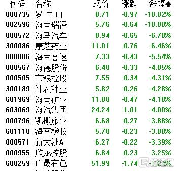 海南板块下挫,罗牛山、海南瑞泽跌停,海马汽车康芝药业海南高速海德股份京粮控股神农种业等跟跌。