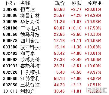 人形机器人板块掀涨停潮恒而达海昌新材华伍股份20CM涨停,四川金顶骏亚科技和而泰龙溪股份睿能科技日发精机涨停,江苏雷利三花智控等上涨。
