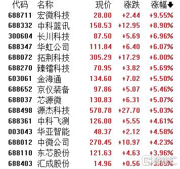 半导体板块走高,宏微科技涨超9%,中科蓝讯长川科技华虹公司拓荆科技臻镭科技金海通京仪装备等跟涨。