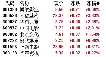 影视院线板块拉升博纳影业涨超9%,幸福蓝海华谊兄弟中国电影北京文化奥飞娱乐上海电影华策影视等跟涨。