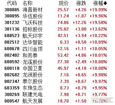 商业航天概念再度走强海昌新材华伍股份20CM涨停,达华智能四川金顶和而泰龙溪股份等多股涨停。