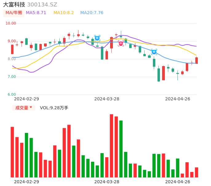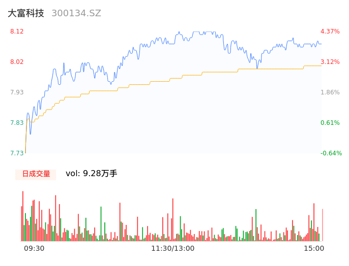 04月26日,大富科技收报8.08,股价涨幅3.86%,成交金额7437.16万元,换手率1.30%。