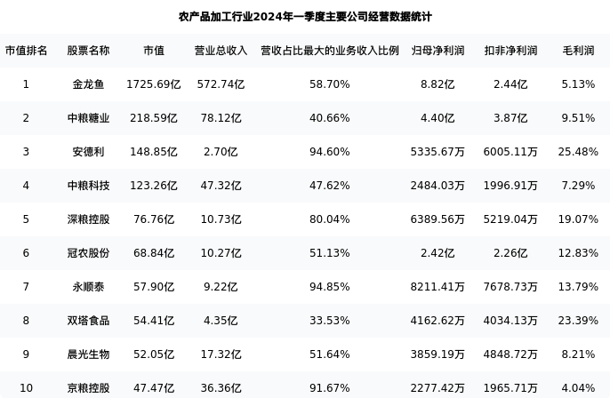 晨光生物最新报告期数据为一季度,下表汇总了农产品加工行业内市值靠前的公司一季度主要经营数据