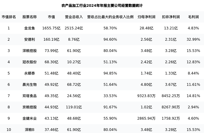 晨光生物最新报告期数据为年报,下表汇总了农产品加工行业内市值靠前的公司年报主要经营数据