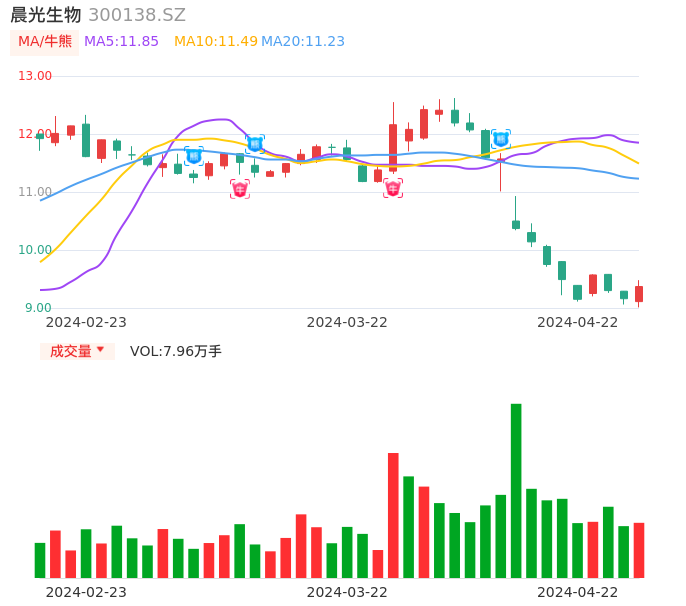 晨光生物在4月9日出现日线级别熊点,从熊点信号发出到今日10日内累积跌幅已经达到19.01%,股价近期跌幅巨大,KD指标数值为:11.95,已经出现超卖信号,短期套牢盘严重,如后期60分钟周期由熊转牛且基本面/消息面未发生重大变化则可能弱势反弹。