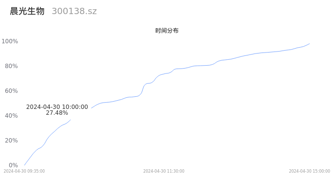 300138晨光生物2024年04月30日成交7.28万手,成交金额6886.00万元,相较昨日缩量2.87万手,换手率1.63%,成交清淡。