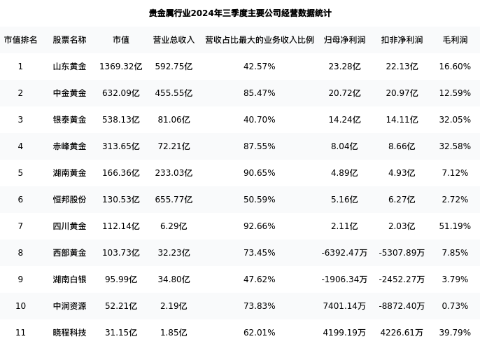 晓程科技最新报告期数据为三季度,下表汇总了贵金属行业内市值靠前的公司三季度主要经营数据