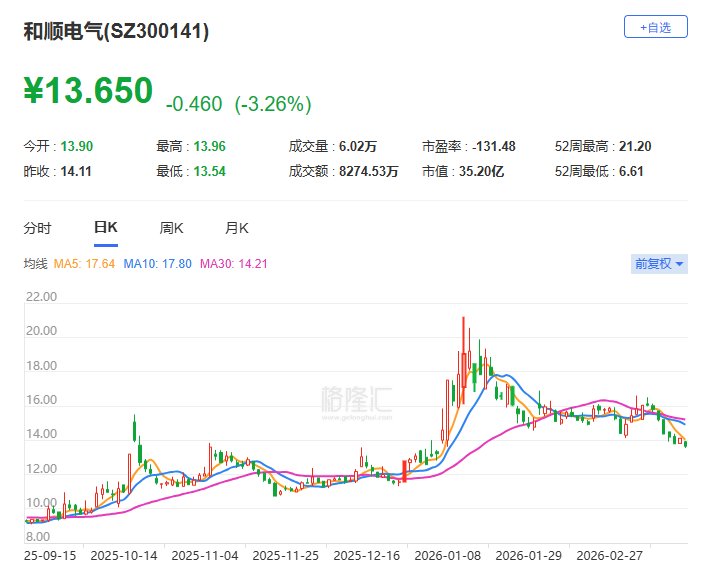 A股异动丨和顺电气盘中跌4% 股价创逾2个月新低