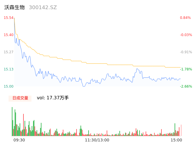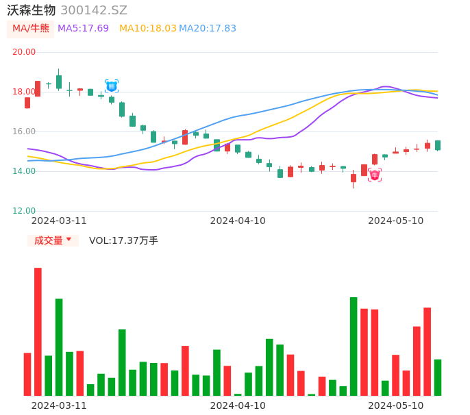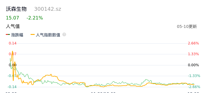 05月10日,沃森生物收报15.07,股价涨幅-2.21%,成交金额2.63亿元,换手率1.11%。