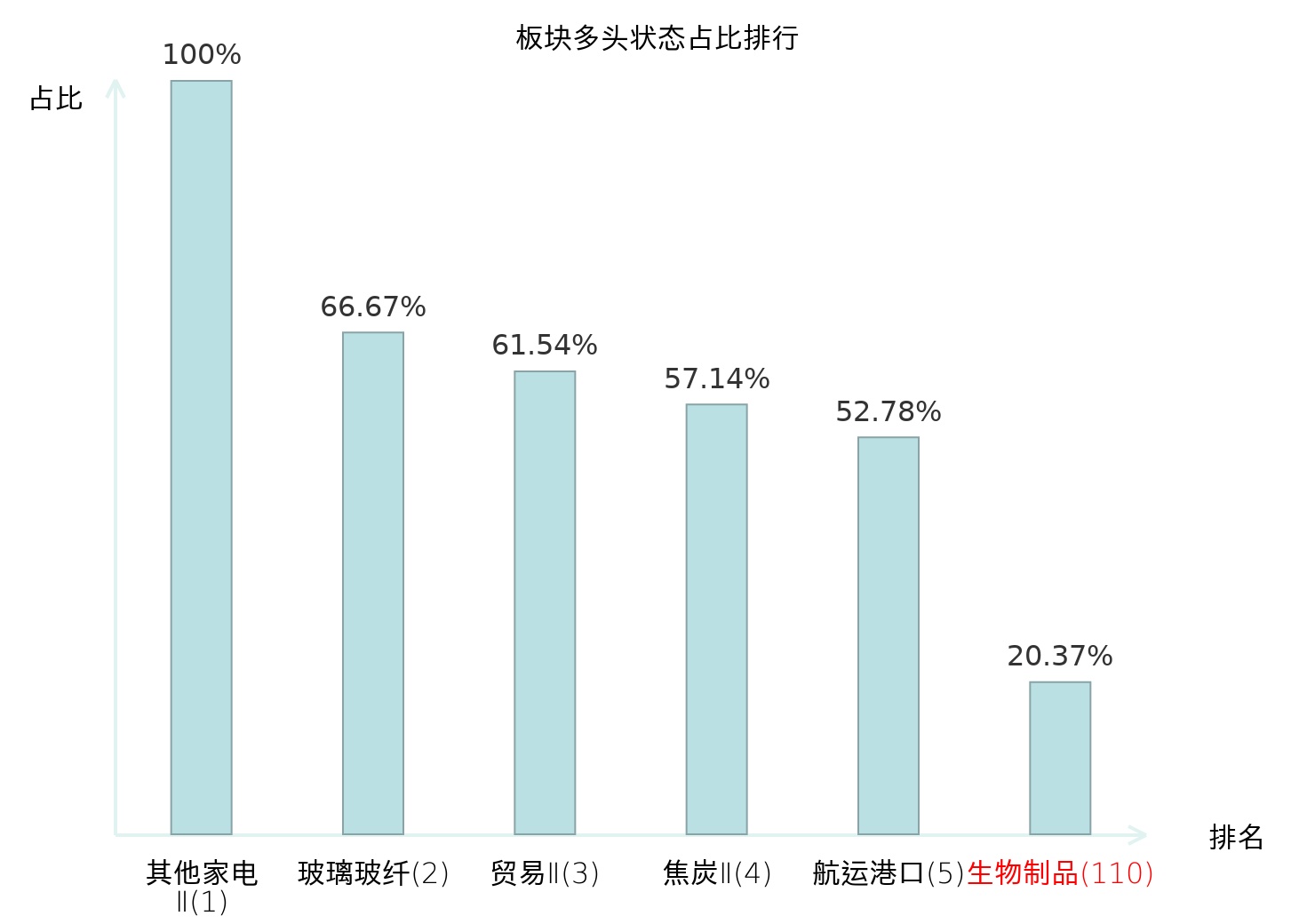 全市场所有行业板块中主力多头状态占比排名中,其他家电Ⅱ板块位居第一。影视院线板块名次提升最快,较昨日上升62位。