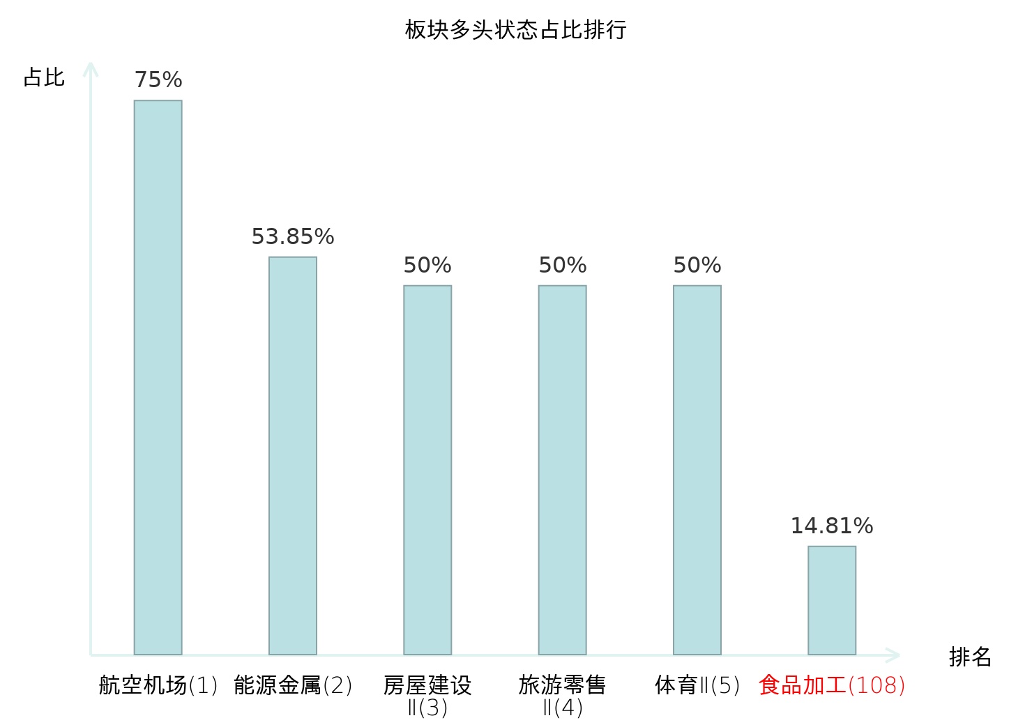 全市场所有行业板块中主力多头状态占比排名中,航空机场板块位居第一。其他电子Ⅱ板块名次提升最快,较昨日上升53位。