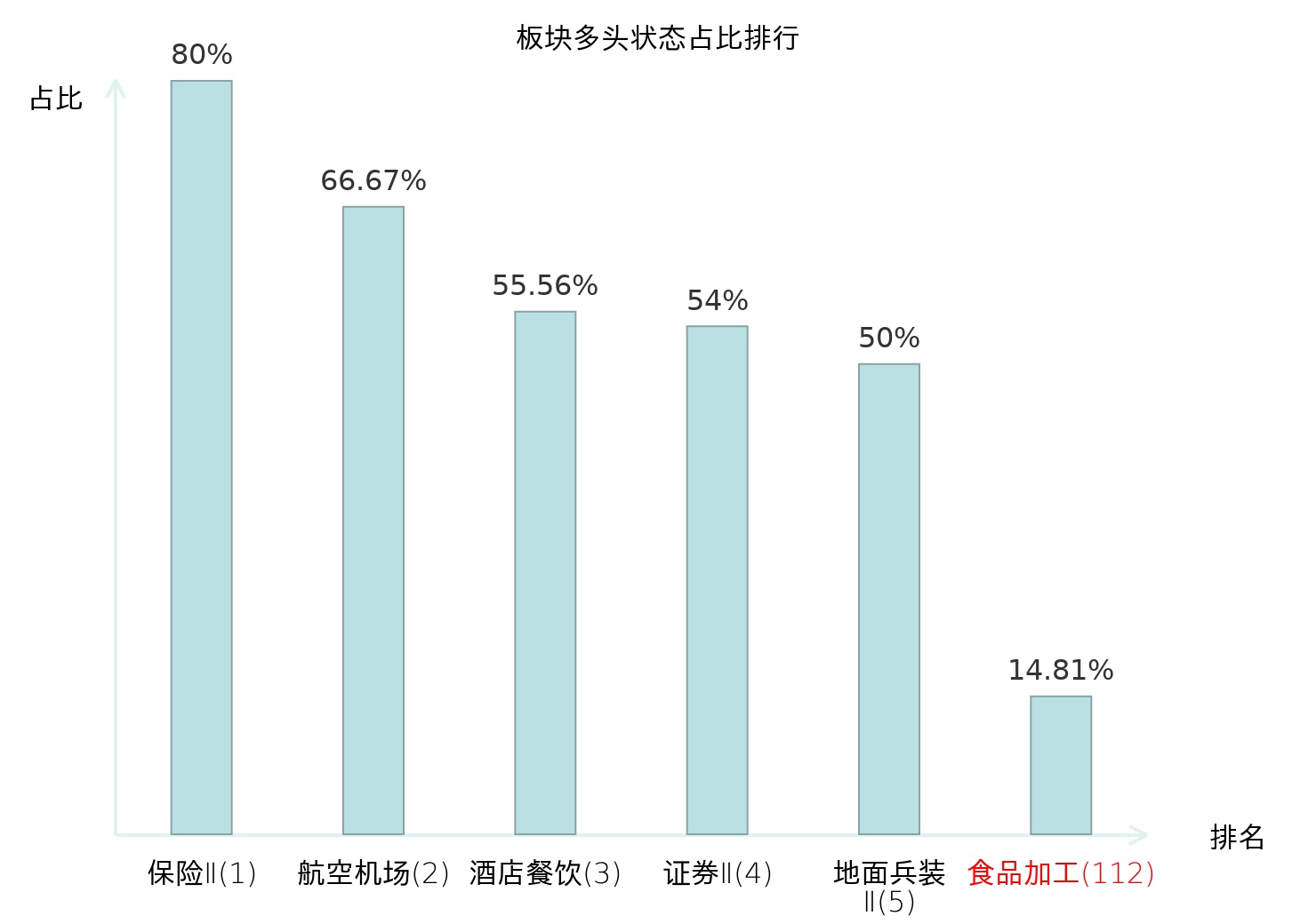 全市场所有行业板块中主力多头状态占比排名中,保险Ⅱ板块位居第一。特钢Ⅱ板块名次提升最快,较昨日上升69位。