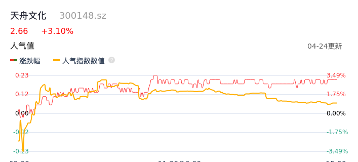 04月24日,天舟文化收报2.66,股价涨幅3.10%,成交金额5019.73万元,换手率2.38%。