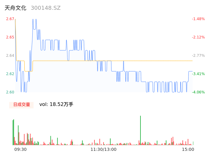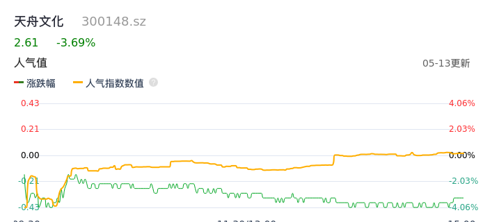 05月13日,天舟文化收报2.61,股价涨幅-3.69%,成交金额4860.65万元,换手率2.31%。