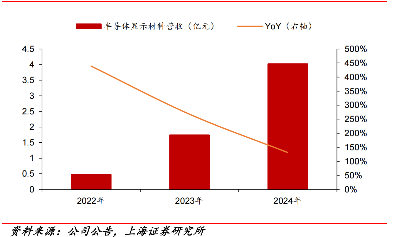 B)显示面板光刻胶:布局核心主材,YPI、PSPI国内领先。公司主要围绕柔性OLED屏幕显示上游“卡脖子”核心主材布局,目前公司YPI、PSPI产品已经成为国内部分主流面板厂的第一供应商。2024年公司半导体显示材料业务收入增长至4.02亿元,收入高速增长;随着仙桃PSPI产线的持续批量供应,以及YPI二期800吨扩产,产能储备将支撑产品进一步放量。