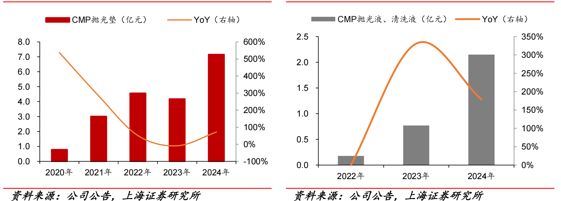 A)CMP制程工艺材料:公司自主布局CMP抛光垫、CMP抛光液、清洗液三大核心耗材。抛光垫方面,公司是国内唯一全面掌握抛光垫全流程核心研发技术的供应商,产品深度渗透国内主流晶圆厂客户,2024年公司抛光垫业务实现收入7.16亿元,同比增长71.51%,单月销量突破历史性新高。随着武汉本部抛光硬垫产能提升,以及公司抛光硬垫在本土外资晶圆厂客户取得突破,有望进一步带动抛光垫业务放量。抛光液、清洗液方面,抛光液搭配自主研磨粒子在客户端形成销量,随着订单放量,2024年公司CMP抛光液、清洗液业务实现收入2.15亿元,同比增长178.89%。
