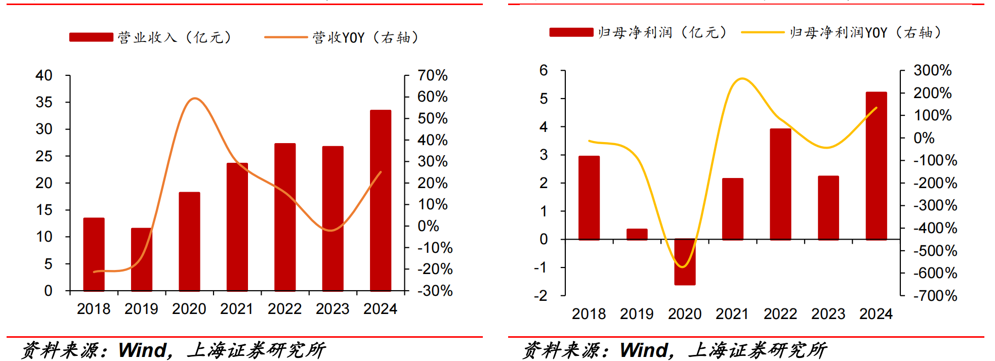 图表2:2018-2024公司营业收入及同比(左)2018-2024公司归母净利润及同比(右)