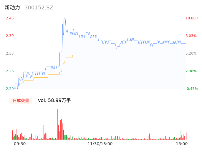 04月29日,新动力收报2.37,股价涨幅7.24%,成交金额1.38亿元,换手率8.28%。