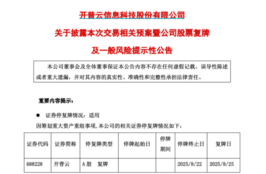 开普云还表示,此次交易尚需提交公司董事会再次审议及公司股东大会审议批准,并需经有权监管机构批准、核准或同意注册后方可正式实施,能否通过上述审批、核准或注册尚存在不确定性。公司将于股票复牌后继续推进相关工作,并严格按照相关法律法规的规定和要求履行信息披露义务。