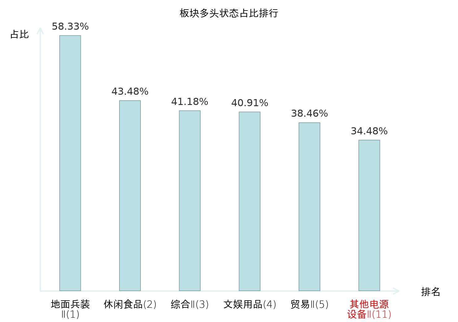 全市场所有行业板块中主力多头状态占比排名中,地面兵装Ⅱ板块位居第一。林业Ⅱ板块名次提升最快,较昨日上升90位。