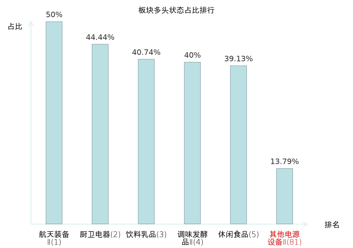 全市场所有行业板块中主力多头状态占比排名中,航天装备Ⅱ板块位居第一。林业Ⅱ板块名次提升最快,较昨日上升92位。