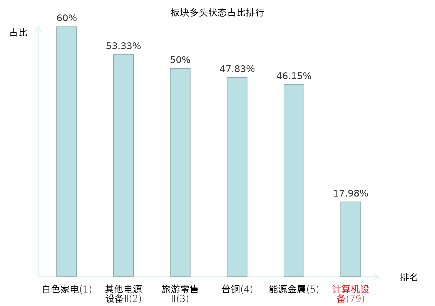 全市场所有行业板块中主力多头状态占比排名中,白色家电板块位居第一。照明设备Ⅱ板块名次提升最快,较昨日上升55位。