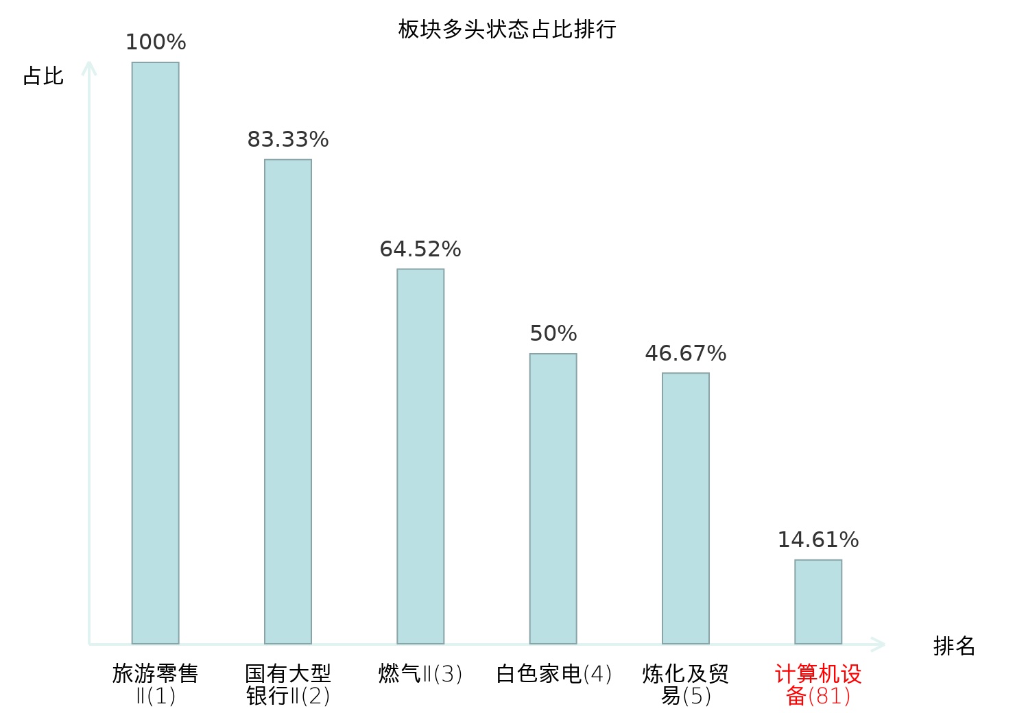 全市场所有行业板块中主力多头状态占比排名中,旅游零售Ⅱ板块位居第一。农产品加工板块名次提升最快,较昨日上升82位。