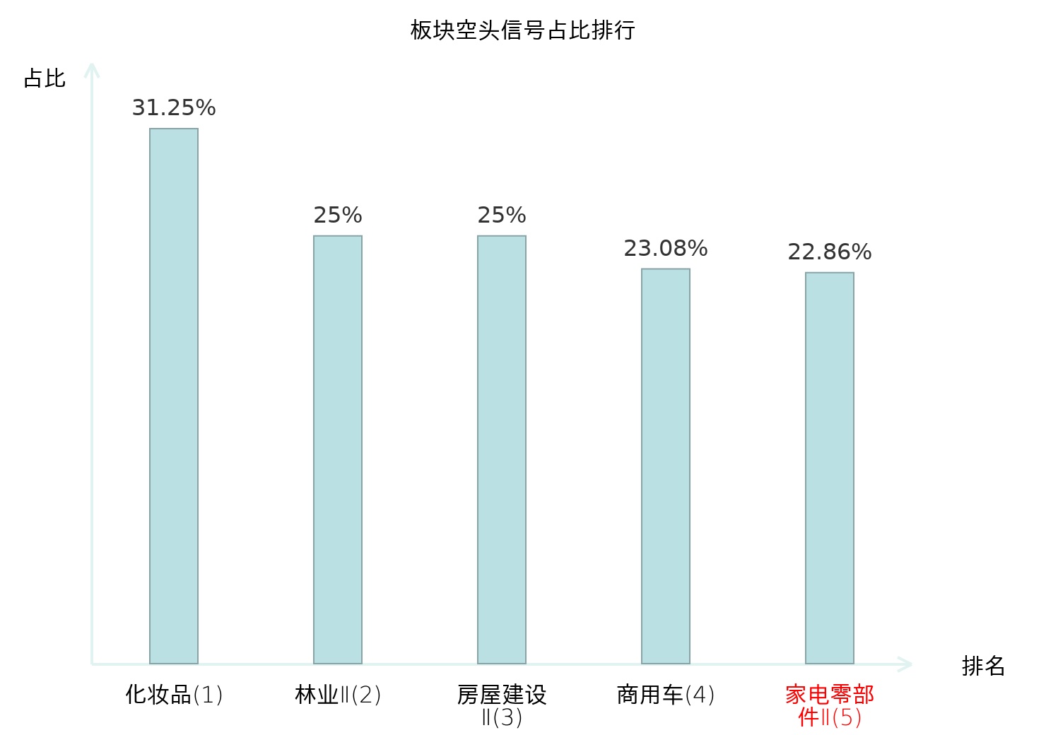 全市场所有行业板块中主力空头信号占比排名中,化妆品板块位居第一。房屋建设Ⅱ板块名次提升最快,较昨日上升113位。