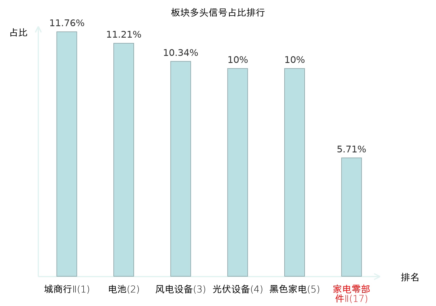 全市场所有行业板块中主力多头信号占比排名中,城商行Ⅱ板块位居第一。黑色家电板块名次提升最快,较昨日上升107位。