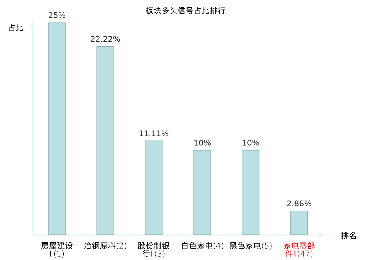 全市场所有行业板块中主力多头信号占比排名中,房屋建设Ⅱ板块位居第一。房屋建设Ⅱ板块名次提升最快,较昨日上升119位。