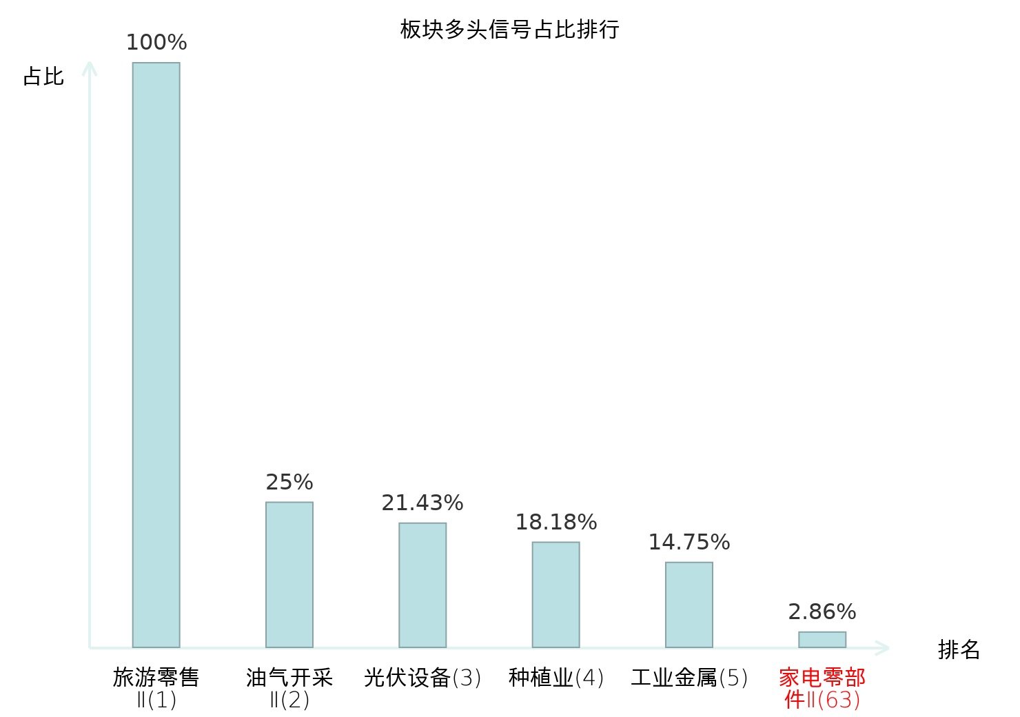 全市场所有行业板块中主力多头信号占比排名中,旅游零售Ⅱ板块位居第一。旅游零售Ⅱ板块名次提升最快,较昨日上升130位。