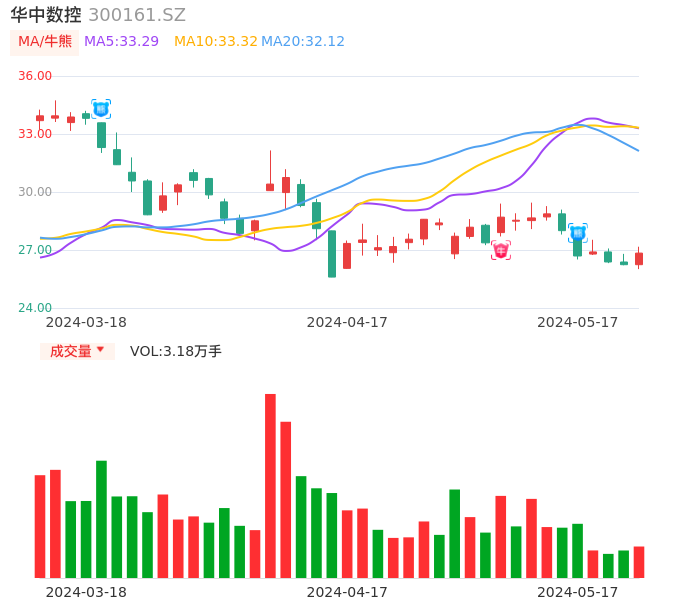 华中数控近期出现日线级别熊点,且60分钟级别也处于熊点区间,股价处于偏弱行情,建议谨慎观望。
