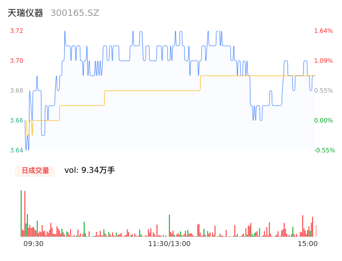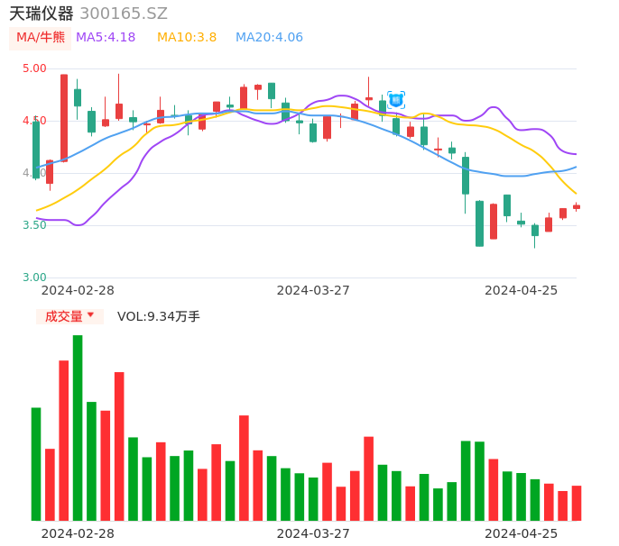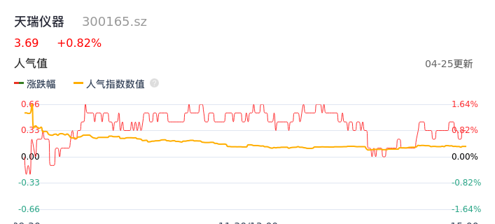 04月25日,天瑞仪器收报3.69,股价涨幅0.82%,成交金额3443.37万元,换手率2.33%。