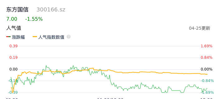 04月25日,东方国信收报7.00,股价涨幅-1.55%,成交金额1.13亿元,换手率1.75%。